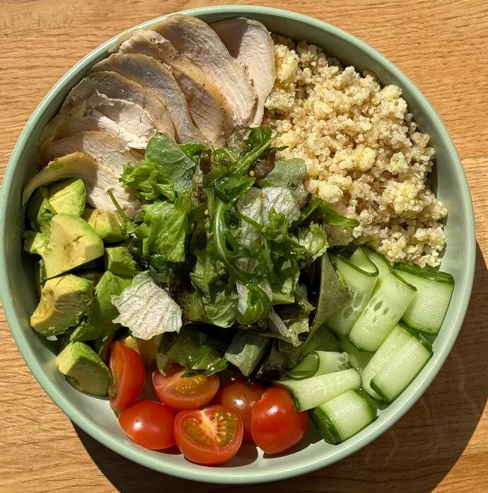 кіноа, кус-кус, огірок, чері, авокадо,запечене куряче філе, мікс салат під медово гірчичним соусом