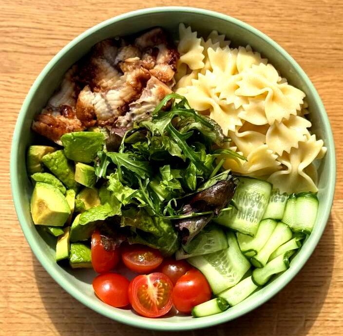паста з твердих сортів пшениці, огірок, чері, авокадо,вугор, мікс салат під медово гірчичним соусом