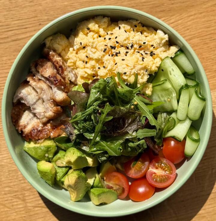 скрембл, огірок, чері, авокадо,вугор, мікс салат під медово гірчичним соусом