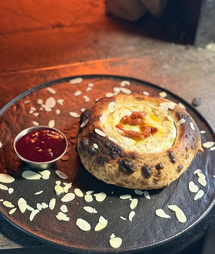 сир камамбер, фокача, вялені томати, ягідний соус готується в печі на дровах вага 120, 60, 50