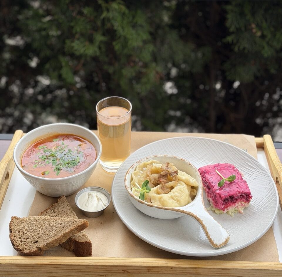 М’ясна юшка 300 гр, вареники з картоплею та шкварками , салат шуба, узвар, хліб, сметана