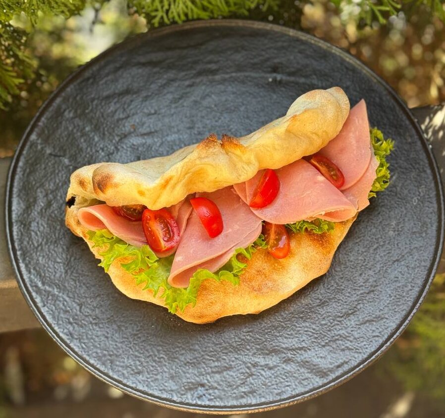 Неаполітанське тісто з печі на дровах в поєнанні з крем-сиром, італійською шинкою котто, салатом та томатами. Ідеальний швидкий перекус.