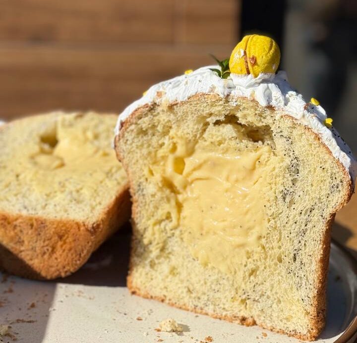 ніжна паска , тісто за секретним італійським рецептом з лимонним курдом та маком , прикрашено білковим кремом та горішками зі згущеним молоком Вага 700 гр