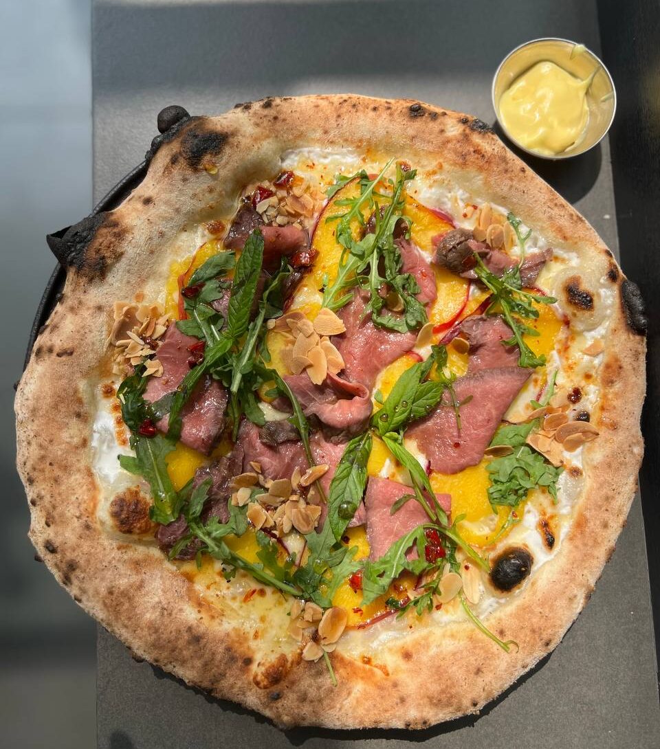 Тісто холодної ферментації з трьох видів італійського борошна, вершкова основа власного виробництва, моцарела, персик, ростбіф власного виробництва