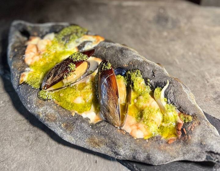 Тісто холодної ферментації з трьох видів італійського борошна, тісто з чорнилом каракатиці, сирні бортики з філадельфії, томатний соус, мідії, кальмар, королівська креветка, соус песто