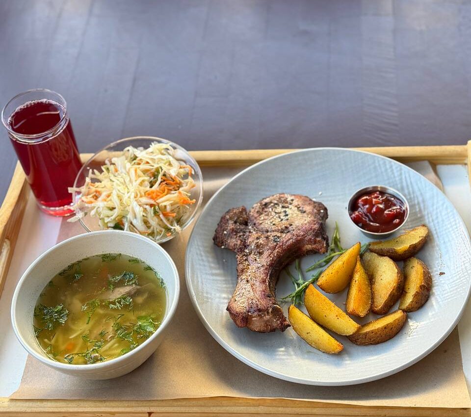 Бульйон 300 гр, картопля печена 120 гр, свинний стейк на ребрі 200 гр, компот, сметана , соус шашличний, хліб з салом