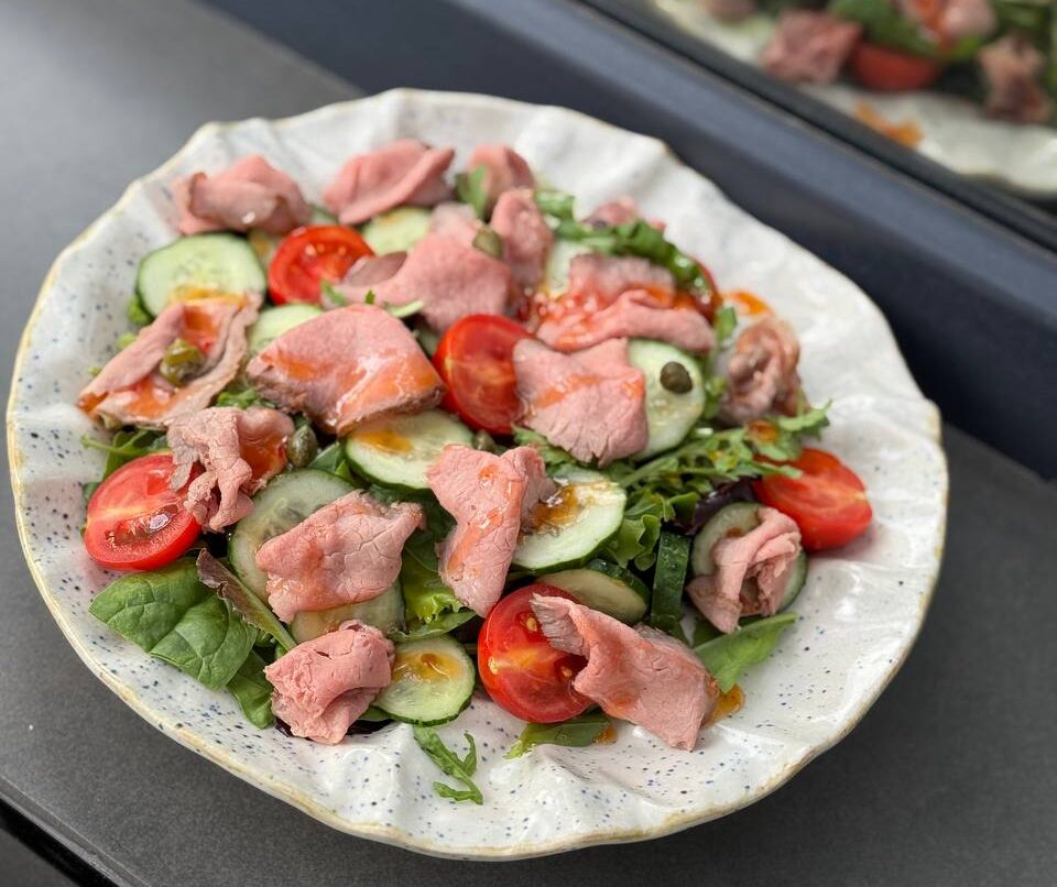 Ніжна телятина сувід, мік салат, крафтова страчатела, чері, огірок, каперси і це все під соусом солодкий чілі Вага 380 гр