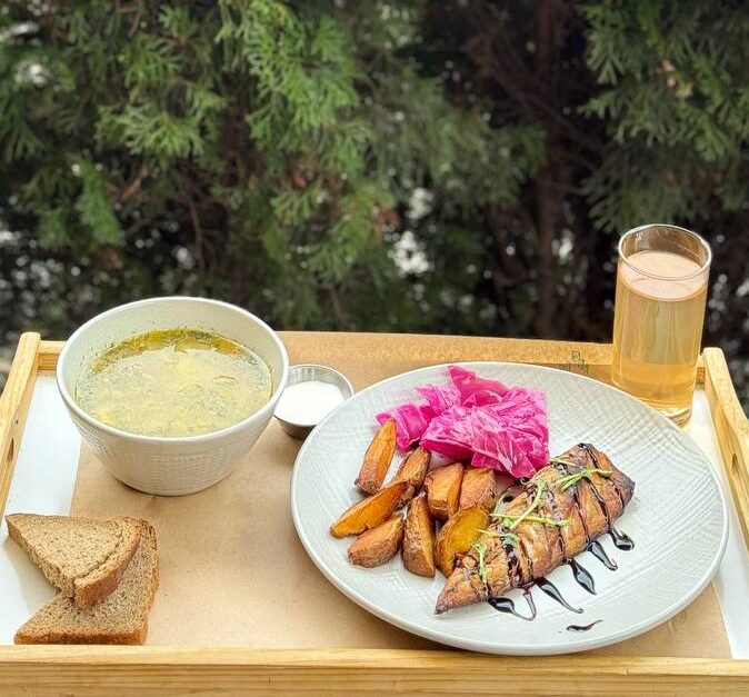 Розсольник 300 гр, картопля печена 150 гр, скумбрія 150 гр, пелюстка з капусти, лимонад, хліб, сметана