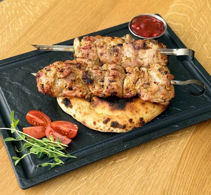 Курячий шашлик з м’яса стегна, соус фірмовий, паляничка щойно з печі.