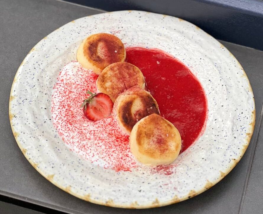 Сирники з полуничним конфі та грецьким йогуртом Вага – 400 гр