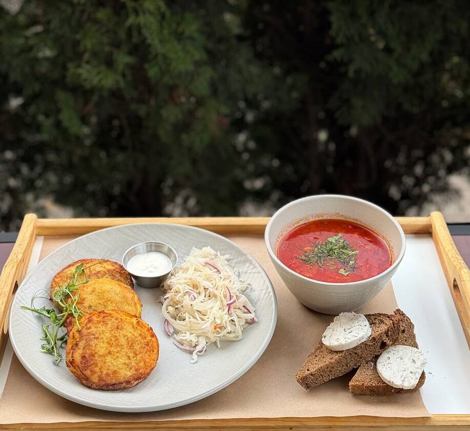 Борщ, деруни з м’ясом, квашена капуста, компот, грінки з салом, сметана