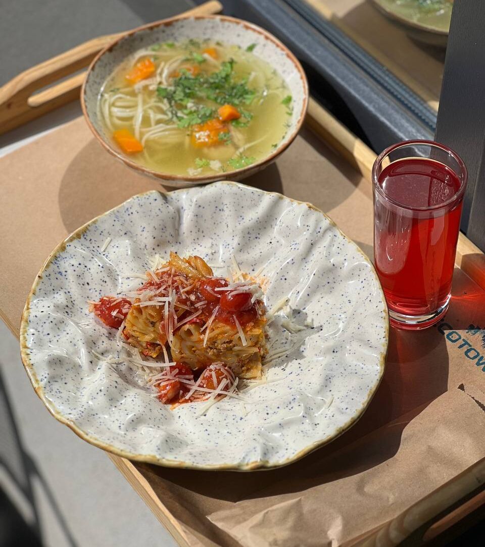 Бульйон, запечена паста болоньєзе з пармезаном і томатами чері, компот, фокача власного виробництва,